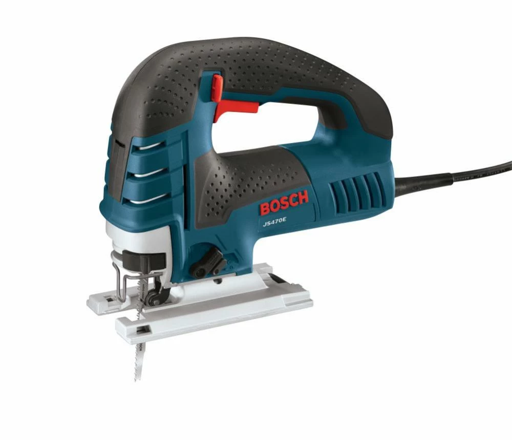 The BOSCH® 7.0-Amp Top-Handle Jig Saw power tool is ideal for making cuts in signs, tabletops and other projects. With its powerful motor, it cuts at a maximum speed of 3,100 strokes per minute. This Bosch jig saw features Constant Response™ circuitry to help prevent overloads and keep the tool running at its peak. The aluminum gearbox has an insulated cover that adds protection to keep the inner workings clear of particles and debris. It has an ergonomic handle, designed to increase your comfort and reduce user fatigue and features a lock-on button for continuous running while you work. This corded jig saw has a particle blower to keep your cutting line clear. Its speed selection dial lets you work with greater consistency, and its four orbital-action settings give you the ability to choose between smooth and aggressive cuts. It bevels to 45 degrees to make angled cuts. Bosch’s exclusive blade clamp securely holds T-shank blades for greater safety and precision. The sturdy foot helps it to stay flat against your work surface for better-looking results, and it features a blade ejection lever as part of its tool-less blade-change system.