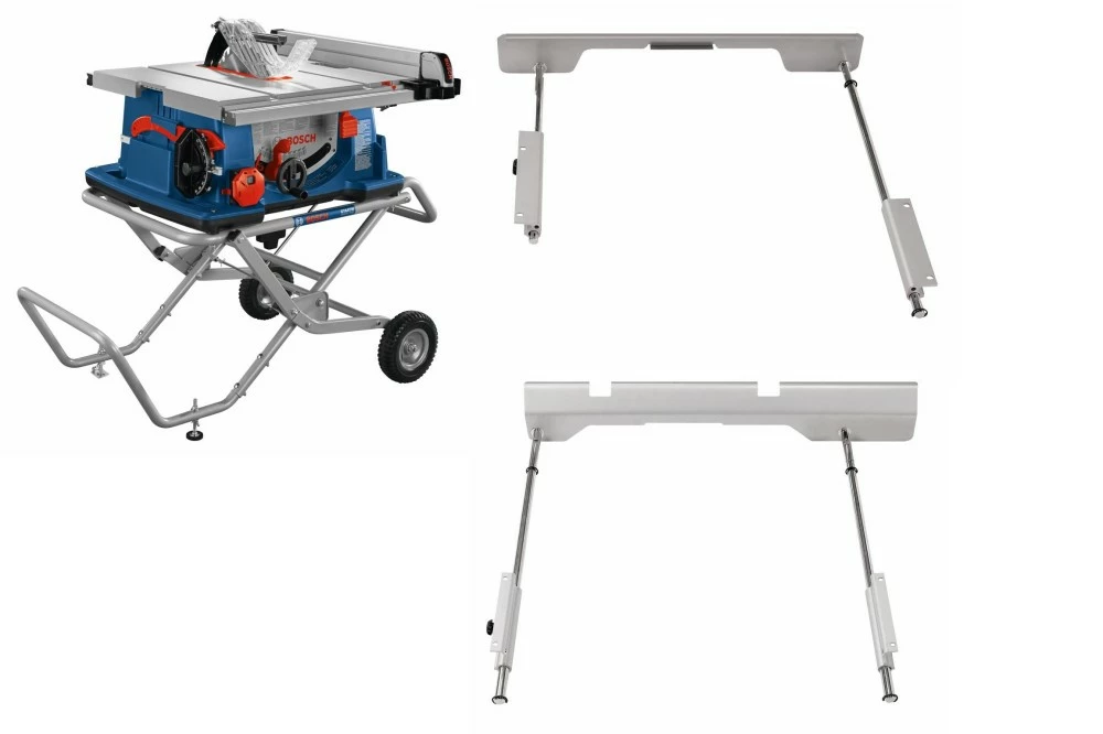 10″ Worksite Table Saw with Gravity-Rise Wheeled Stand + Left Side Support & Outfeed Support delivers both professional rip capacity and outstanding portability for a tool that can get the job done, wherever it is. The powerful 15-Amp saw delivers 4.0 max HP for outstanding productivity. It also incorporates soft-start circuitry for smooth but quick ramp-up to the operating speed. It includes Constant Response circuitry to help maintain speed under load, restart protection to avoid accidental startup and overload protection. The SquareLock rip fence is engineered for maximum trueness and great ease-of-use. It includes an enhanced auxiliary fence for narrow workpieces. The lighter GTA47W Gravity-Rise Wheeled Stand has 8 In. treaded rubber-composite tires and a single-action design for easy set-up and transport. It is jobsite-ready with heavy-duty construction. The Smart Guard System features a three-position adjustable riving knife, anti-kickback pawls and non-obstructed-view barrier guard assembly. The table saw provides a 30 In. x 22-1/2 In. tabletop with a 30 In. rip capacity for ripping 4 Ft. wide sheets goods in half. Also included are the Outfeed Support Assembly (TS1016) and Left Side Support (TS1008). Bosch TS1016 extends 18 In. and stores flush to table. It extends the working depth of Bosch 4000, 4100, GTS1041A 10 In. table saw. It features hardened metal construction; aluminum mounts and includes table saw extension. The Bosch TS1008 left side support extension increases the width of your table. This provides additional support for cutting larger work pieces.