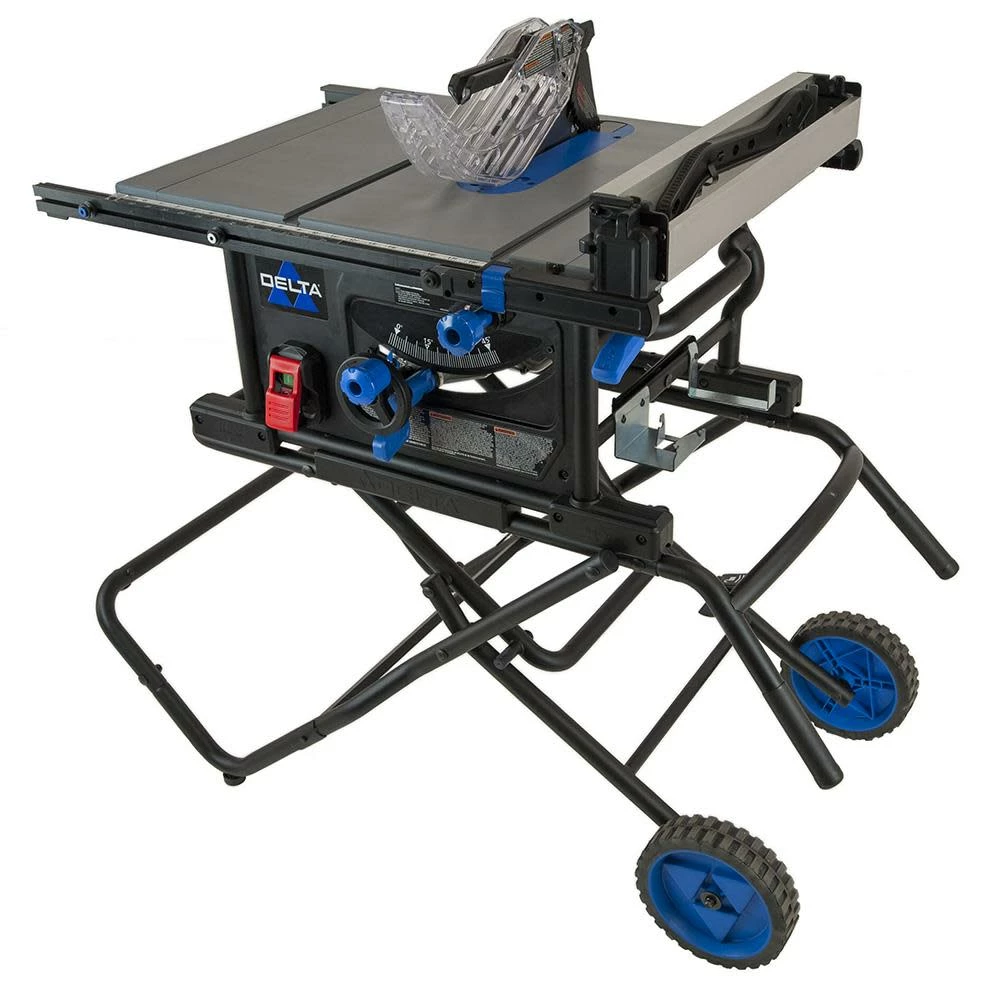 The Delta 36-6023 has a powerful 15 amp motor that easily rips through hardwood and pressure treated lumber. The large 32 ½ inch rip capacity provides a stable surface for large materials. A rack and pinion fence system makes fence adjustments accurate, smooth and fast. This saw combined with a portable rolling stand that folds down in one step makes moving and storing the saw quick and easy.