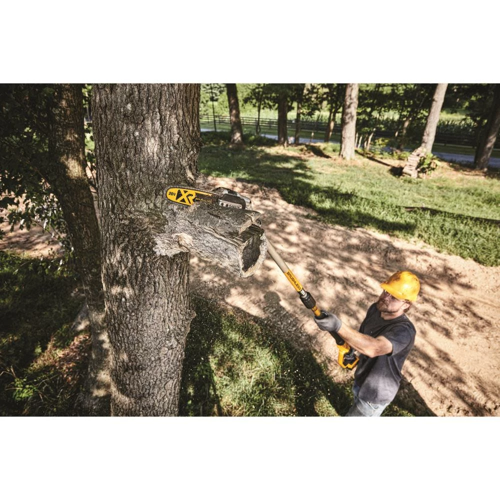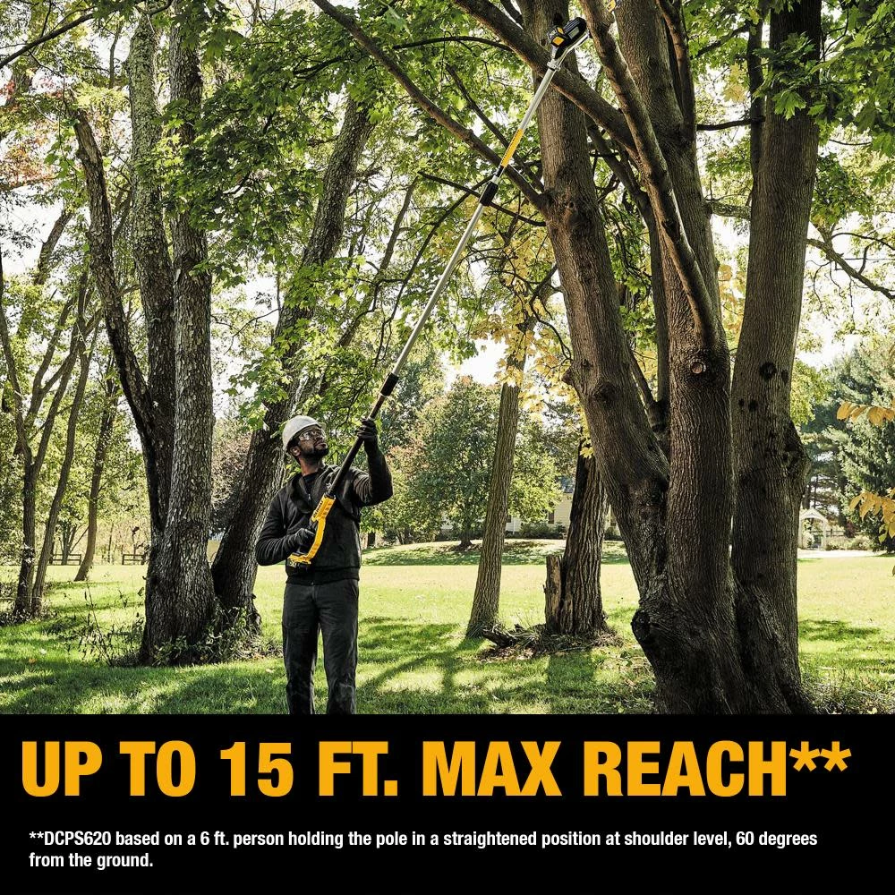 DCPS620 Pole saw reaches up to 15 ft.*** and delivers up to 96 cuts per charge**