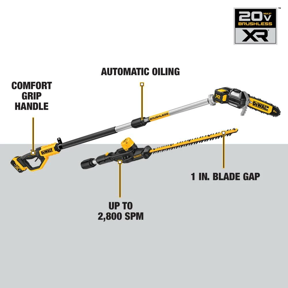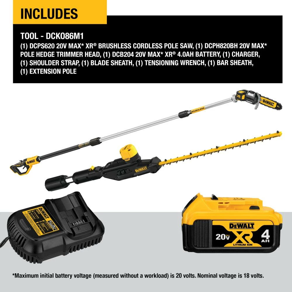 This DeWALT 20 Volt Max cordless tool combo kit includes a DCPS620 pole saw, DCPH820 pole hedge trimmer head, DCB204 battery and a DCB112 charger. The pole saw reaches up to 15 Feet and delivers up to 96 cuts per charge. Pole hedge trimmer head is designed to assure reach up to 12 Feet. Trimmer head has a 22 Inch steel, laser-cut, dual-action blade for fast cutting with 2800 SPM. Tool kit also contains shoulder strap, blade sheath, tensioning wrench, bar sheath and an extension pole.