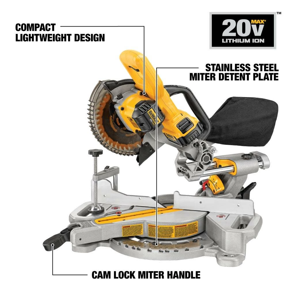 The DeWALT 20 Volt Max sliding miter saw has adjustable stainless steel miter detent plate along with 11 positive stops to enhance productivity and assures cutting accuracy. Cordless tool with 5/8 Inch arbor and 7-1/4 Inch diameter blade provides no load speed rating of 4100 RPM. Miter saw featuring integrated cut line cross-cut positioning system offers adjustment-free cut line indication for increased accuracy as well as visibility. Compact and lightweight construction facilitates easy transportation and storage. It has capacity to cup 3-5/8 Inch nested crown and 3-1/2 Inch base vertically. The precise miter system and machined base fence support of tool increases durability and cutting accuracy. Oversized bevel scale makes bevel angle adjustments precise, quick and easy. Tool is integrated with cam lock miter handle, which assures fast and accurate miter angles. Saw utilizes 20 Volt Max battery pack that offers average 183 cuts of 2×4 pine or 275 cuts of 3-1/4 pine baseboard. This tool comes with a battery and charger.
