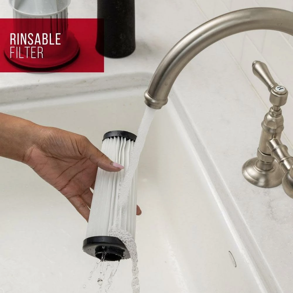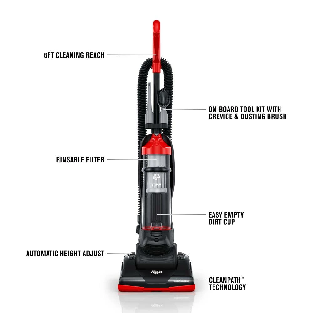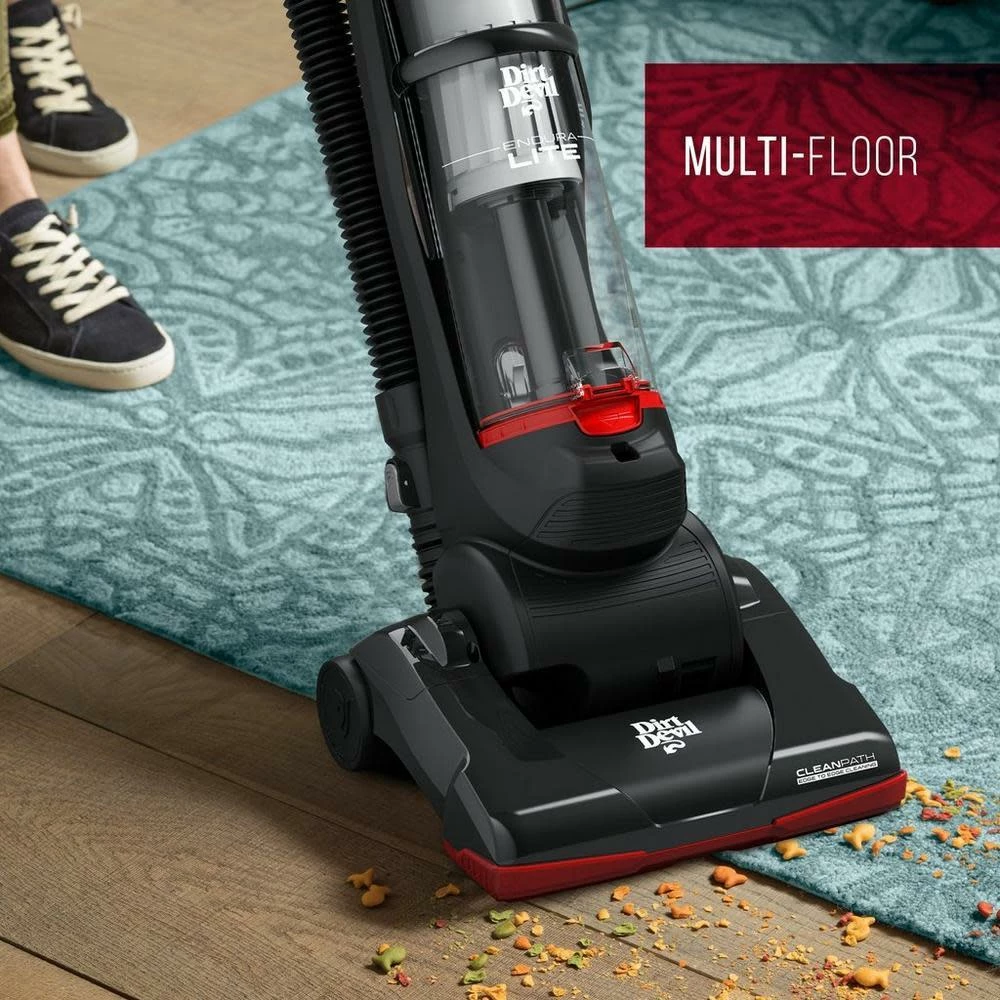 Weighing less than 9 pounds, the Dirt Devil Endura Lite Upright Vacuum can easily power through messes in-between furniture, under your bed and any other tight spaces. The three-stage Endura filtration system gives you a deep, effective clean for Advanced Performance with long-lasting, no loss of suction*. Plus, use the above floor cleaning hose and crevice tool to tackle debris on your coffee table and other above floor spaces. Wrap-up your clean with the touch of a button to empty your dirt cup while never touching the dirt again.