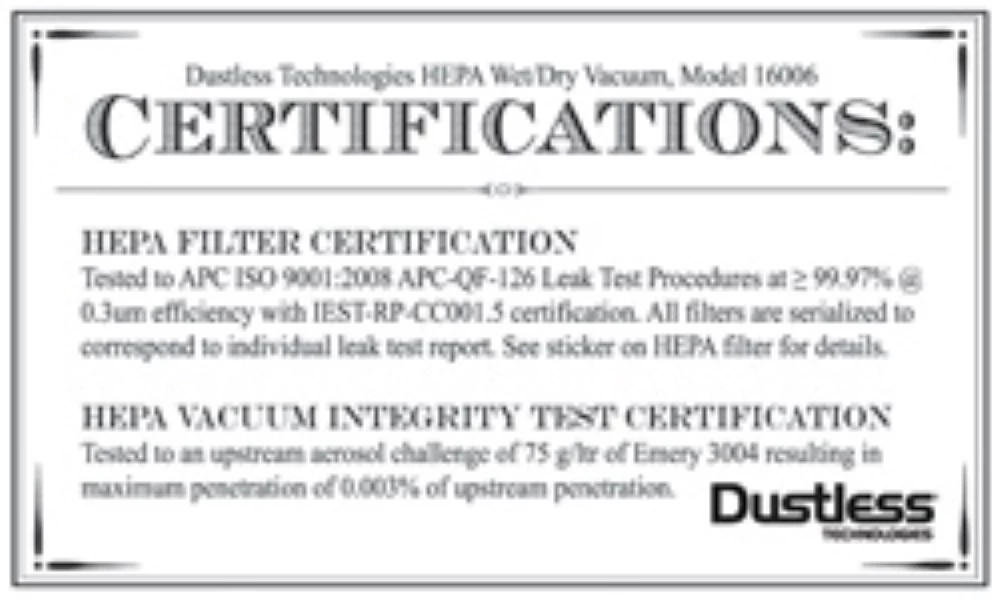 Dustless HEPA filters are individually certified and serialized, meaning they’ve been laboratory tested to be compliant with OSHA and EPA laws for hazardous material containment.