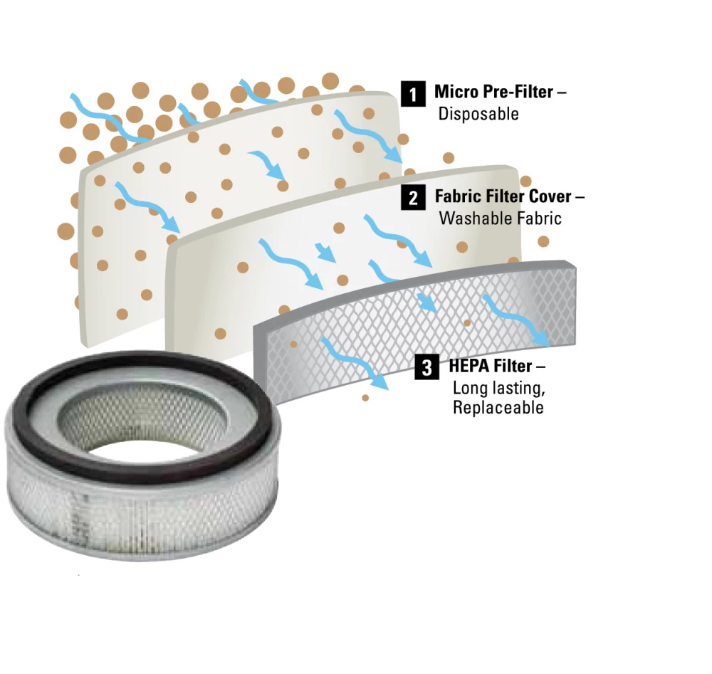 A Dustless HEPA filter captures 99.97% of particles at 0.3 microns. That is 0.00003 centimeters across, much smaller than the width of a human hair, a red blood cell, bacteria, pollen, and allergens.