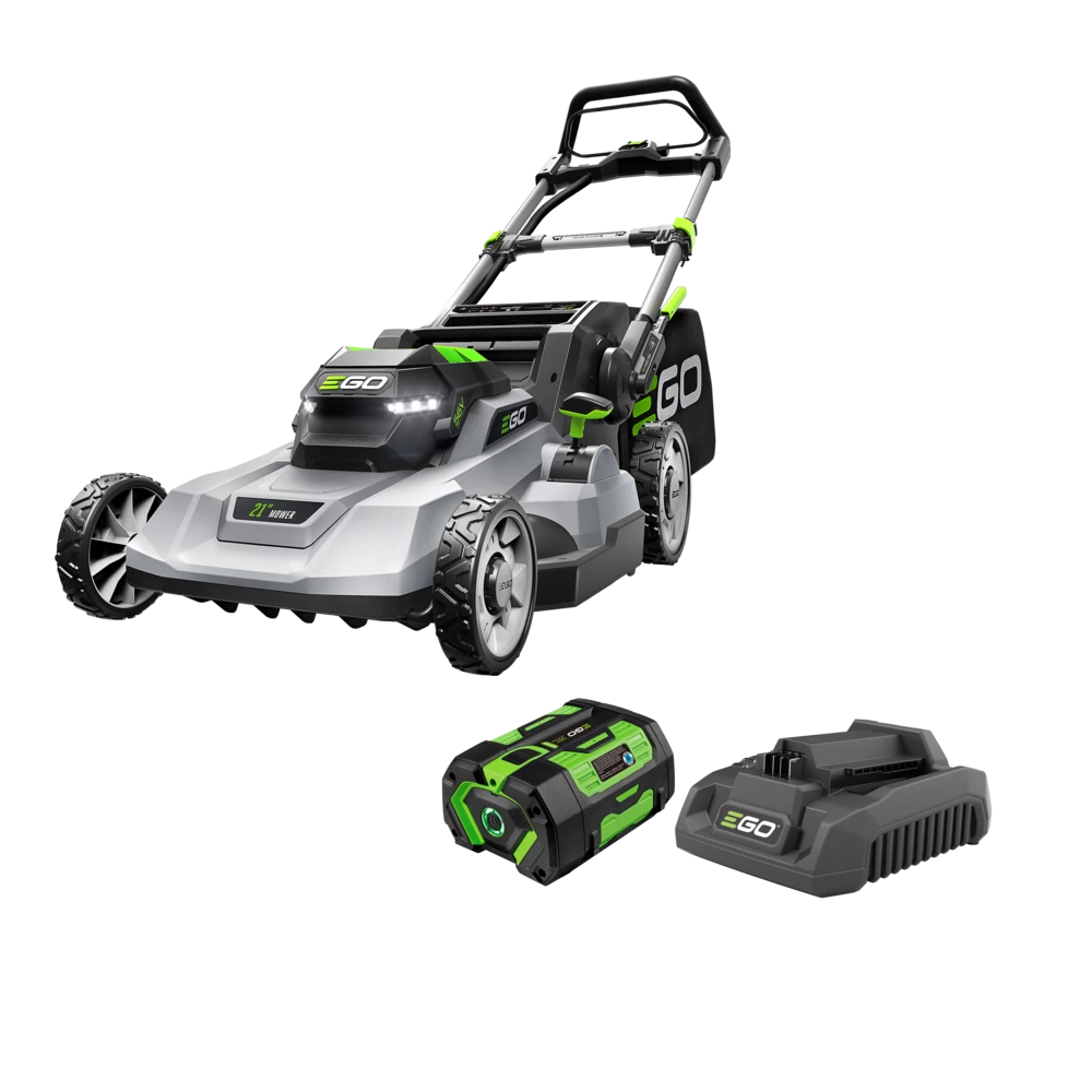 The EGO POWER+ 21” Mower delivers 6.0 foot-pounds of torque—power that exceeds gas without the noise, fuss, or fumes. The high-efficiency brushless motor delivers long runtimes, low vibration, and lifelong durability. This electric lawn mower delivers up to 55 minutes of run time on a single charge with the included 56V ARC Lithium™ battery. The cordless lawn mower delivers precision cutting with its advanced mulching blade and seven cutting height positions from 1.25 to 4 inches, adjustable with one hand. Three-in-one functionality delivers your choice of mulching, side discharge, or bagging your grass clippings; an easy-access two-bushel grass collection bag is included. This push lawn mower includes bright LED lights for added visibility when mowing at dawn or dusk, and it folds flat for compact storage between cuts. Experience Power Beyond Belief™ with the EGO POWER+ 21” Lawn Mower.