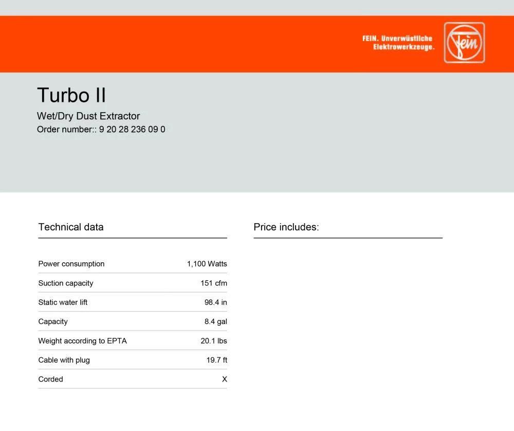 The FEIN Turbo vacuums are sophisticated professional tools for effective dust extraction from power tools and to clean workplaces, both in the shop and on-site. The lightweight, robust FEIN Turbo vacuums set standards in the compact vacuum class by being incredibly powerful and versatile. Due to their compact size, they ensure effective dust extraction, even in tight conditions. The FEIN Turbo vacuums offer a convenient and practical accessory storage area.