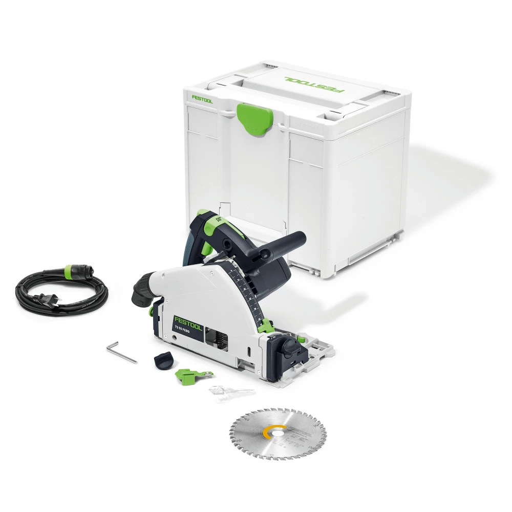 The concentrated torque of our track saw enables work progress at up to twice the speed with an increased saw blade service life. Our new generation of saw blades impresses when combined with maximum cutting performance and perfect cutting quality. With the clip-on splinter guard in combination with the guide rail, it is even possible to saw on both sides without virtually any splinters. The TS 55 enables precise work. The cutting edge from 90 Deg to 47 Deg remains unchanged even when the saw swivels. Combined with our guide rails, a wide range of saw blades, the dust extraction systems, saw table, angle stop and splinter guard, we offer a top-class sawing system. The spring-loaded riving knife helps to prevent binding and makes it easier to insert the blade in existing joints. The angles 0 Deg and 45 Deg can be selected directly using the locking positions. Undercuts are also possible with the extended adjustment option from -1 Deg to 47 Deg. Transparent sliding viewing window and the additional markings for the starting and end point provide a good view of the saw blade. The slimline housing allows users to make cuts up to the edges and in close proximity to the wall (12 mm). Our fitted control electronics enable speed control for temperature monitoring and perfect adaptation to the material (for FEBQ variant only). Always adapted to the working material. The FastFix spindle stop makes it extremely easy to change the saw blade. The correct saw blade is fitted in just a few steps and the sawing speed is adapted to the material. Easy to read and adjust: The dual cutting depth scale for working with or without a guide rail. Now even easier thanks to extra-large font and precision adjustment.