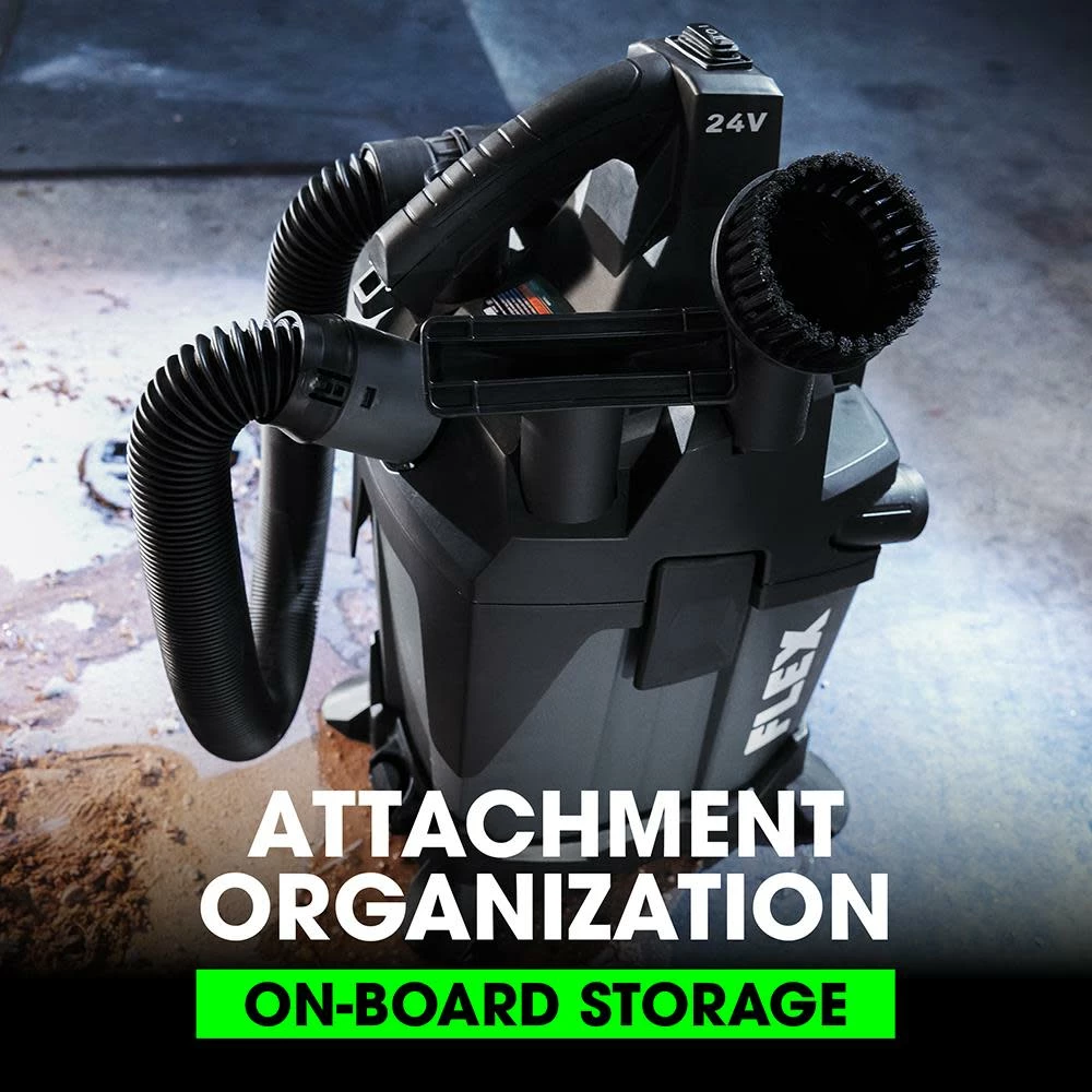 The FLEX 1.6 Gallon Wet/Dry Vacuum dominates spills, dust, and debris with powerful suction. Optimize your runtime and performance to meet job demands with enhanced Eco and Boost modes. Clogs are a thing of the past with instant flow reversal, keeping the filter clear and suction maxed. On-board storage keeps attachments ready. This jobsite vacuum is also powered by the same superior FLEX Advantage as other FLEX power tools, meaning unmatched 24V battery power, runtime, and fast charging speed. (Battery sold separately.) All protected by a 5-year, end-to-end warranty.