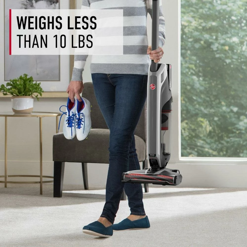 The Hoover ONEPWR Evolve Pet Elite provides superior suction across all floor types. A high-performance brushless motor paired with HushTone Technology delivers 50% more suction power without compromising performance for a quiet, efficient clean. Cover hard floors and carpets cord-free with the ONEPWR 4Ah Battery for over 35 minutes of runtime (2). The ultra-lightweight design comes in under 10 lbs without sacrificing a powerful clean. Armed with the Tangle Guard brushroll, prevent hair wrap up to 9 inches and tackle those tough pet messes. Clean your filter less often with 15 Cyclone Technology that captures 99.9% of dirt and dust particles, making this the perfect solution for high traffic areas. The ONEPWR Evolve Pet Elite is free standing and equipped with an XL Dirt Cup, Four Modes of Power Control, and LED headlights so you can see everything in its path and never miss a beat.