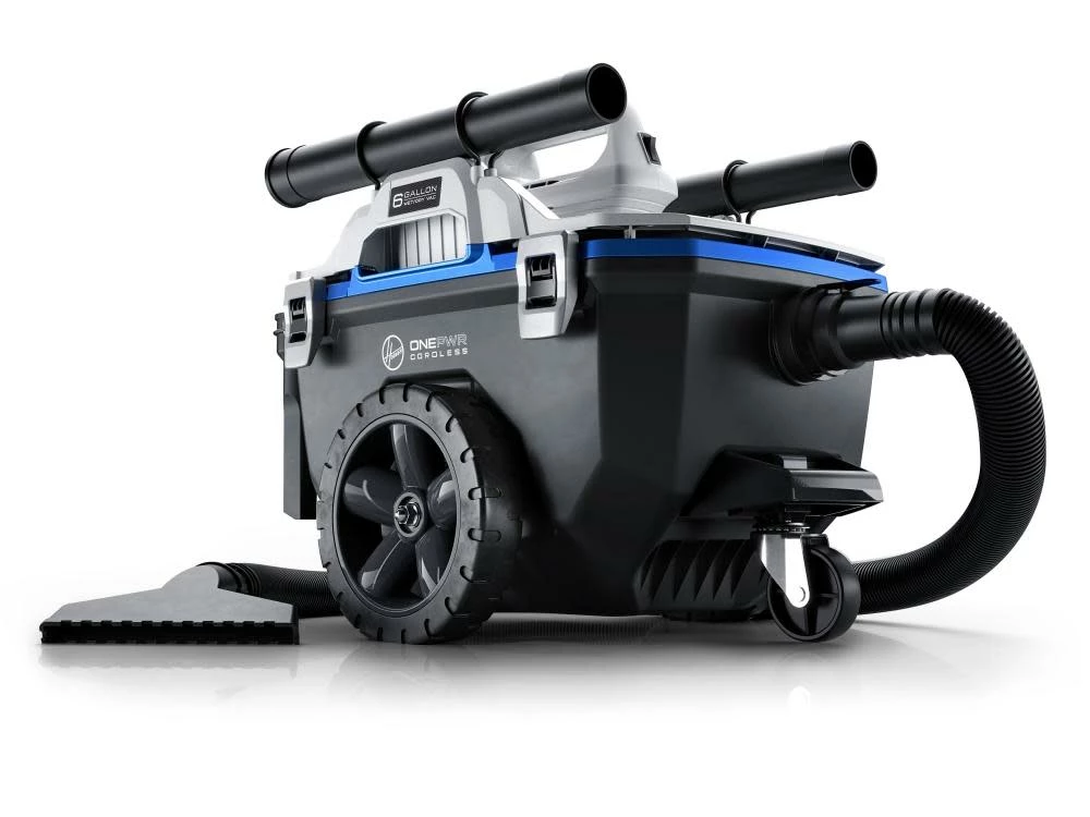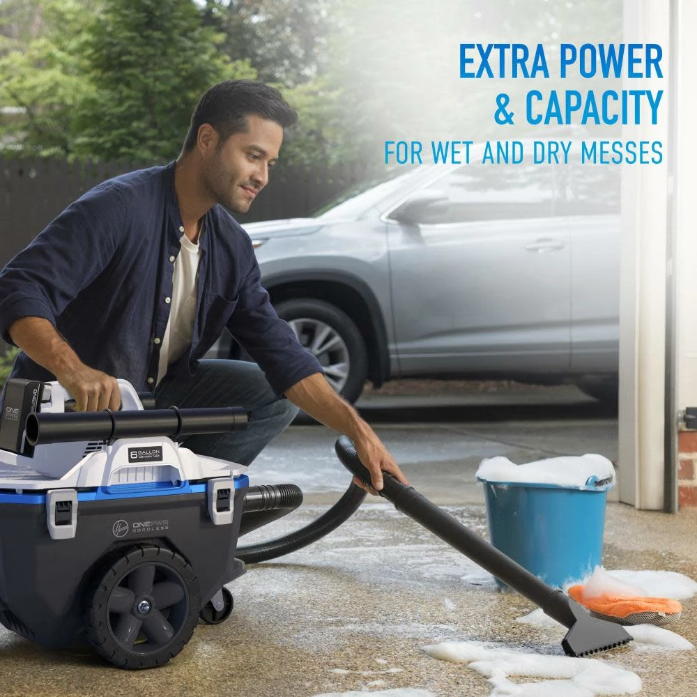 The HOOVER® ONEPWR™ Cordless High-Capacity Utility Vacuum combines extra powerful suction (up to 65 CFM) with a convenient, easy to use, durable design. Regardless if you’re indoor or out, it’s XL capacity, No-Tip Wheel Design, and full set of multi-purpose tools allows you to clean larger messes while easily maneuvering around obstacles. With extra power and capacity you can tackle any wet or dry mess with confidence, while the easy-empty tank keeps clean ups mess-free.