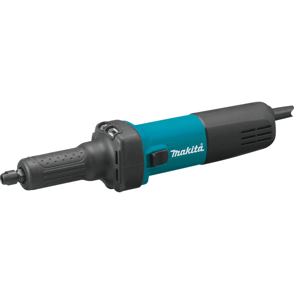 The Makita 1/4 Inch die grinder with AC/DC switch, is powered by a powerful 3.5 Amp motor that delivers 25000 RPM. Protective zig-zag varnish seals the armature so that no dust or debris enters. Labyrinth construction offers long lasting durability by preventing the entry of debris to motor, bearings and gears. Round-shaped collet nut is designed to avoid damages/scratches to work piece. Rubberized gear housing for enhanced operator comfort while the stepped neck allows for working in tights spaces. Directional air-flow vents channel the tool’s air output away from the operator. The grinder is perfect for welders, plumbers, ship builders, automotive, HVAC and more. Paddle switch die grinder produces just 73 dB which helps to reduce workplace noise.