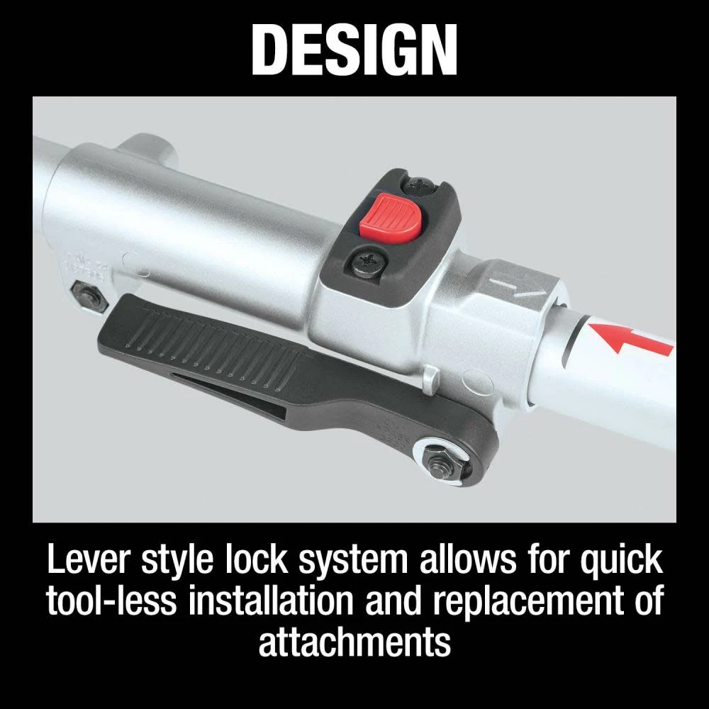 The Power Head features a lever-style lock system for quick tool-less installation and replacement of attachments. It comes with a 13” string trimmer attachment and is compatible with a variety of other attachments for trimming, edging, cultivating, and brush cutting (sold separately).