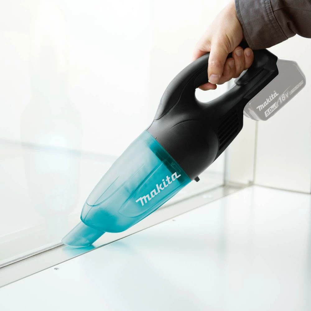 The Makita compact cordless vacuum features powerful motor that delivers strong suction up to 46 CFM for fast and efficient cleaning. Tool powered by 18 Volt Lithium-Ion slide style battery assures fastest charge time, more working time and minimal sitting time on the charger. It continuously operates up to 33 minutes on a single charge. Vacuum with increased storage capacity, has bagless 2-stage cloth filtration system for easier cleaning and quicker debris disposal. Redesigned floor nozzle in this tool offers improved maneuverability and debris collection. Tool with battery, weighs only 3.2 lb and has ergonomic soft grip handle that reduces user fatigue and provides increased comfort on the job. Vacuum featured with Star Protection Computer Controls™, allows the Star Protection-equipped tool and battery to exchange data in real time. This Star Protection communication technology also monitors condition while in use to safeguard against over-loading, over-discharging and over-heating. This compact vacuum can be used as hand-vac and with the floor nozzle extension for floors, carpets and hard to reach spaces.