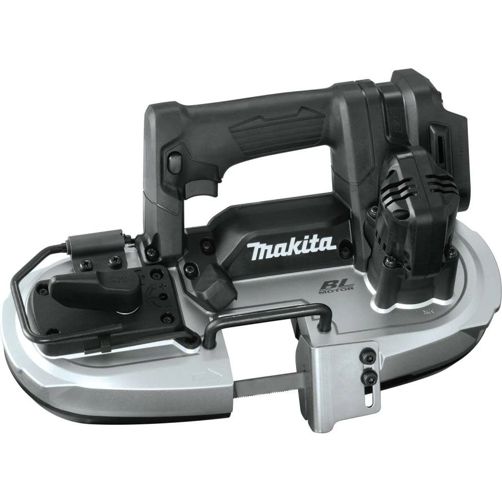The Makita 18V LXT® Sub-Compact Cordless Band Saw is designed for one-handed operation in confined spaces and overhead applications. The band saw is powered by a brushless motor that delivers 160 cuts of 3/4″ EMT in one full charge. It comes with a LED light that illuminates your work area in low light conditions. Overload protection safeguards the motor from burnout in any high torque situations. Die-cast aluminum gear and blade housing ensures durability and high cutting stability. The cordless saw has 2 x 2″ cutting capacity and is ideal for cutting multiple materials. Constant speed control automatically applies extra power to the motor to maintain speed under load during challenging jobs. The blade tracking dial allows to adjust for enhanced cutting performance quickly. Protect from overloading, over-discharging and over-heating with Star Protection Computer Controls™. A tool-less blade change lever ensures easy installation and minimal downtime. Additionally, the catch bar helps overcomes accidental follow through during repetitive cutting.