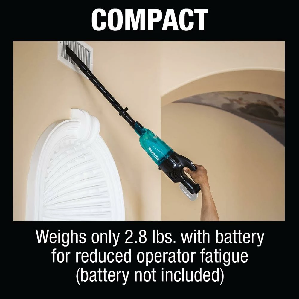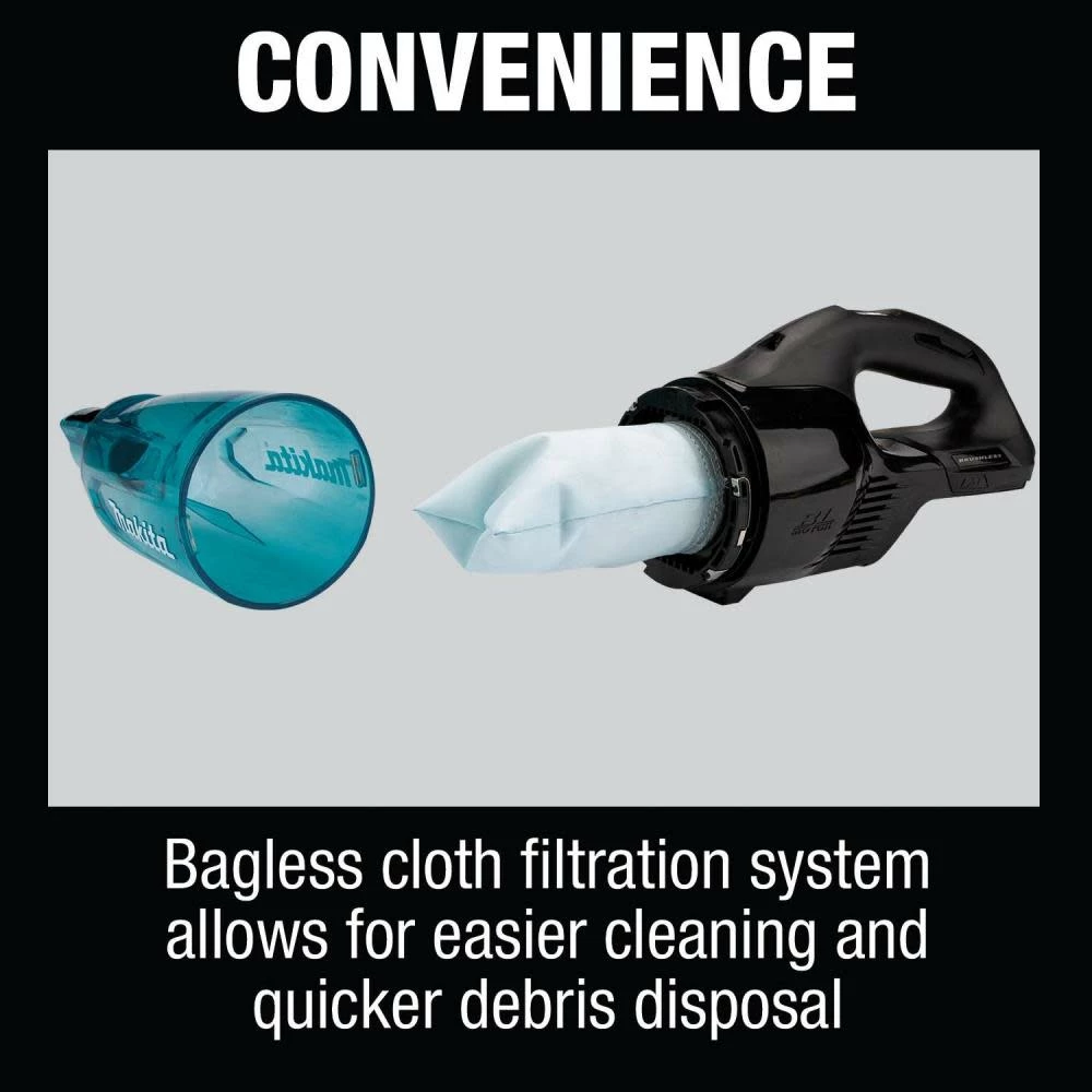 The Makita 18 Volt LXT® cordless vacuum ensures user to experience new level of convenience, efficiency and productivity. This compact and powerful cordless vacuum with strong suction ensures fast and efficient cleaning. Vacuum has efficient and powerful Makita built BL™ brushless motor that runs cooler, more efficient and delivers up to 53 CFM. It has a push button 3-speed power selection for effective operation. Compact and ergonomic vacuum offers superior operator comfort and minimal fatigue. Bagless cloth filtration system of vacuum offers easier cleaning and quicker debris disposal. Increased storage capacity of vacuum ensures longer time between waste disposal. It is equipped with ergonomic soft grip handle to offer superior comfort. Vacuum is featured with Star Protection Computer Controls™ to safeguard against over-loading, over-discharging and over-heating. Vacuum with a fully charged 18 Volt 5.0 Amp-hour LXT® battery (battery not included) delivers up to 83 minutes of continuous use in low speed.