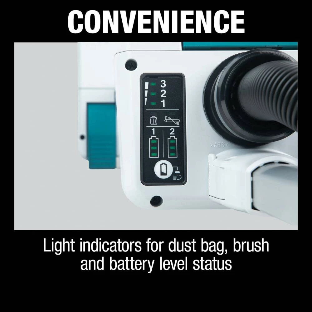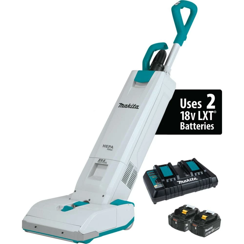 The Makita 1.3 gal 12 Inch upright vacuum kit includes two 18 Volt LXT® Lithium-Ion 6.0 Amp-hour batteries, dual port rapid charger, round brush, long sash nozzle, HEPA filter and filter dust bag. It is powered by a brushless motor that delivers 67 cfm of suction power and 48 Inch of water lift. Lithium-Ion batteries offer up to 60 minutes of continuous run time on low setting and 30 minutes on high setting. The efficient two stage HEPA filtration system has capacity to capture up to 99.97% of particulates and also maintains optimum suction efficiency and longer filter life. Brushless motor is electronically controlled to minimize battery energy use up to 50% longer run time per charge. The star protection computer controls safeguards from overloading, over-discharging and over-heating. Built-in LED light illuminates work area allowing to work with ease even in low light conditions. The non-marring bumper safeguards damage to furniture, baseboards, door-frames and walls. Light indicators are provided for dust bag, brush and battery to indicate the battery status. The four-height adjustment levels ensures optimal cleaning on all floors. Toolless design and accessible brush roller allows for easy removal of hair and clogs.