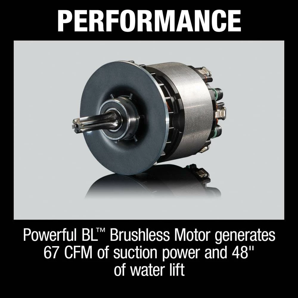 Powerful BL™ Brushless Motor generates 67 CFM of suction power and 48″ of water lift