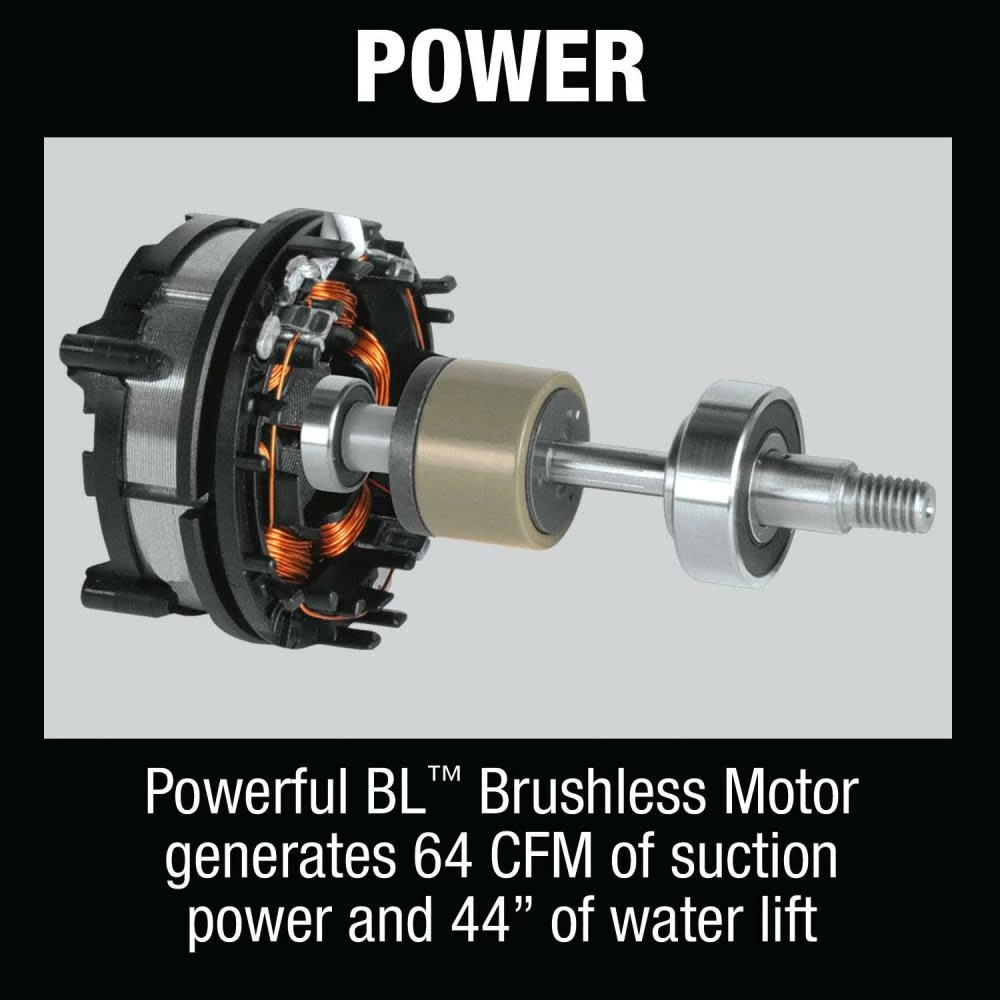 Powerful BL™ Brushless Motor generates 64 CFM of suction power and 44″ of water lift