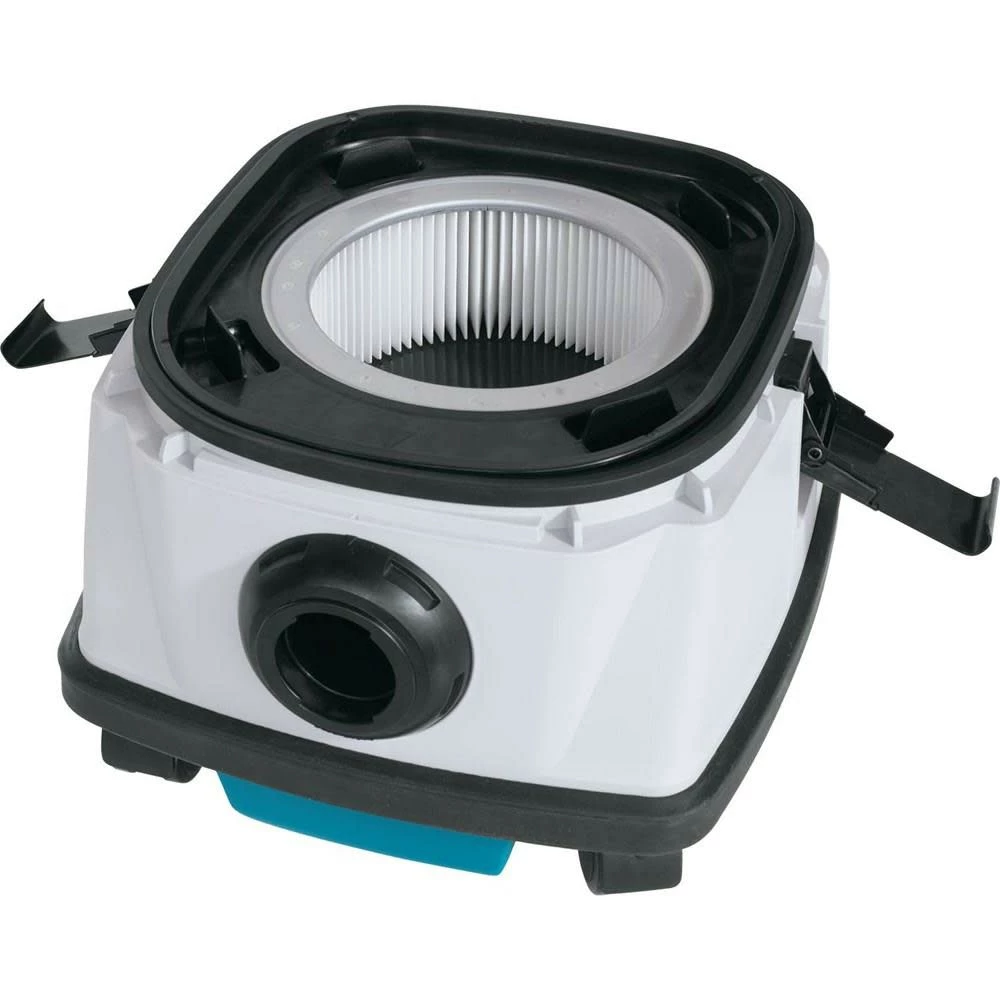 The Makita cordless/corded dry dust extractor/vacuum is powered by a Makita-built motor that delivers 127 cfm and 96 Inch water lift. Lithium-Ion batteries offer up to 65 minutes of continuous run time on low setting and 30 minutes on high setting. The efficient three stage HEPA filtration system has capacity to capture up to 99.97% of particulates and also maintains optimum suction efficiency and longer filter life. Motor chamber is constructed using quality sound-absorbing materials, which makes this vacuum to operate at very low sound level of 75 dB. Large rubber bumper avoids damage to the work environment. The rear casters are provided with locking levers to avoid accidental moving of vacuum. The star protection computer controls safeguards from overloading, over-discharging and over-heating. Oversized on-off switch offers great operator convenience. It includes two anti-static hose, crevice tool, nozzle, curved pipe, straight pipe, main filter, damper and pre-filter.