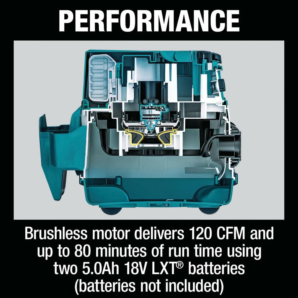 Powerful Makita-built brushless motor delivers 120 CFM and 44″ water lift of suction