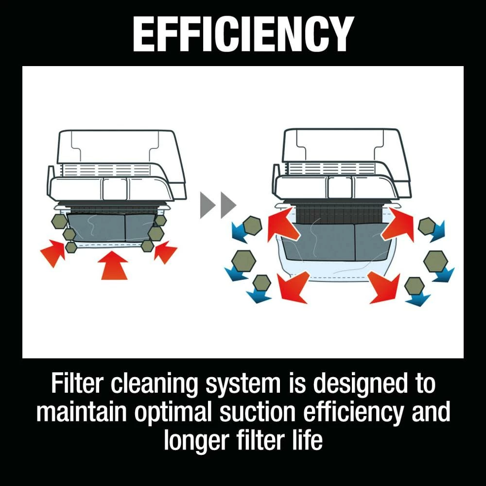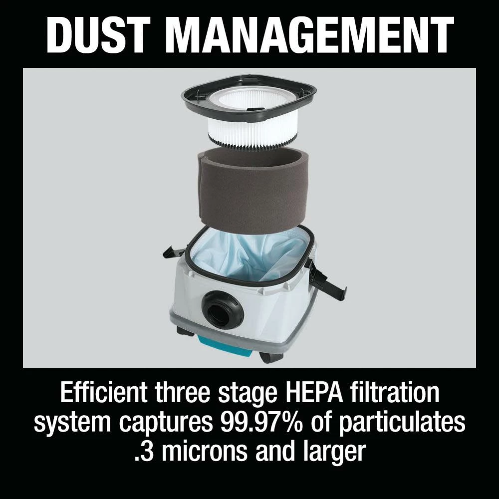 The Makita brushless 2.1 gallon extractor/vacuum is run by a brushless motor that delivers an air flow of 120 cfm and a runtime of 80 minutes. Three-stage filtration system helps in capturing 99.97% of particulates that are 0.3 microns and larger. Vacuum offers a water lift of 44 Inch for efficient suction and cleaning. Sound-absorbing materials that are present inside the chamber ensures a low noise operation. Auto-start wireless mechanism makes use of Bluetooth technology to facilitate wireless communication between tool and dust extractor. Oversized on/off switch makes it easy to use and the speed control dial enables easy monitoring of operating speed. Dual LED battery indicators shows the charge level of the battery. Large rubber bumper safeguards the surface from any scratches and dents. Casters at the back side prevents the vacuum from moving unnecessarily. Removable storage box can accommodate small batteries and accessories.