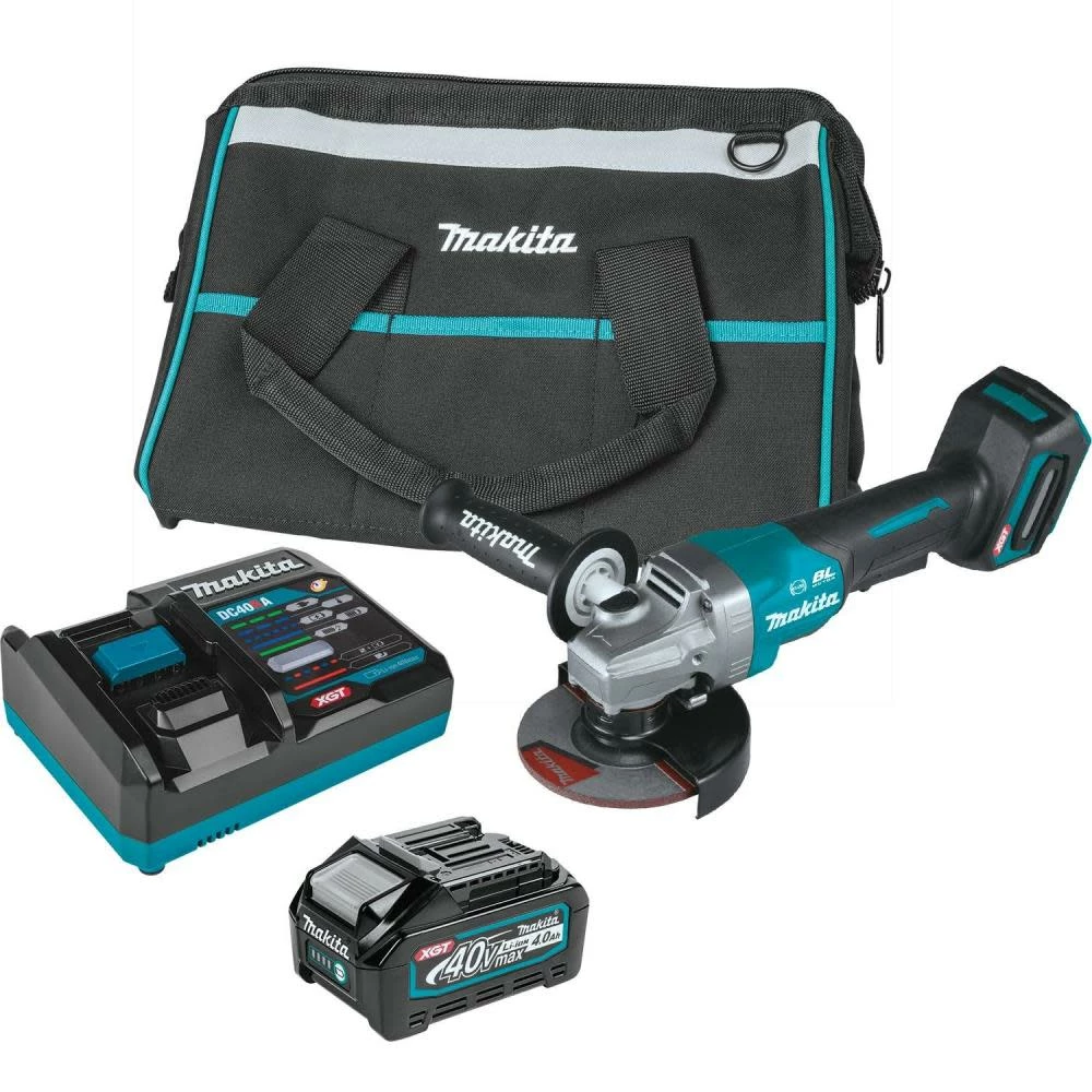 The Makita XGT® brushless cordless 5 Inch angle grinder kit is powered by a Makita-built 40 Volt brushless motor that delivers an operating speed of 8500 RPM for heavy-duty applications. Grinder gives more cutting speed when cutting 5/8 Inch rebar that helps in cutting a wide range of materials such as tile, concrete, pipe, conduit and more. Electric current limiter reduces the overloading of motor in high torque applications. Automatic speed change mechanism adjusts the speed and torque automatically depending upon the applications. Electric brake ceases the grinding in just 2 seconds or less. If the rotation of the wheel comes to a stop, the active feedback-sensing technology turns off the motor immediately. Paddle switch gives power-start press points at multiple grip positions for user convenience and the quick guard rotation facilitates tool-less adjustments. Anti-restart mechanism prevents sudden initiation of the motor when the battery is inserted while the sliding switch is still on. Soft-start mechanism negates start-up reaction for easy initiation of the motor.