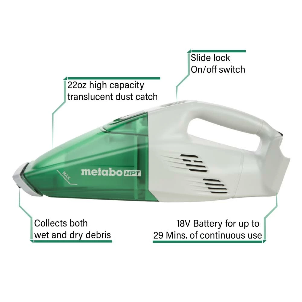 This 18V cordless vacuum features impressive suction power for fast and efficient cleaning of any workshop or home. At only 3.3lbs and just under 17″ in length, this powerful handheld vacuum features a convenient slide lock-on switch for continuous use to reduce fatigue. It accepts a 3.0Ah or 1.5Ah Lithium Ion slide-type battery (not included) that provides up to 29 minutes of non-stop use (with 3.0Ah battery). The large capacity (22oz) translucent dust catch makes it easy to view when the unit needs to be emptied. This vacuum is capable of collecting both wet and dry debris.