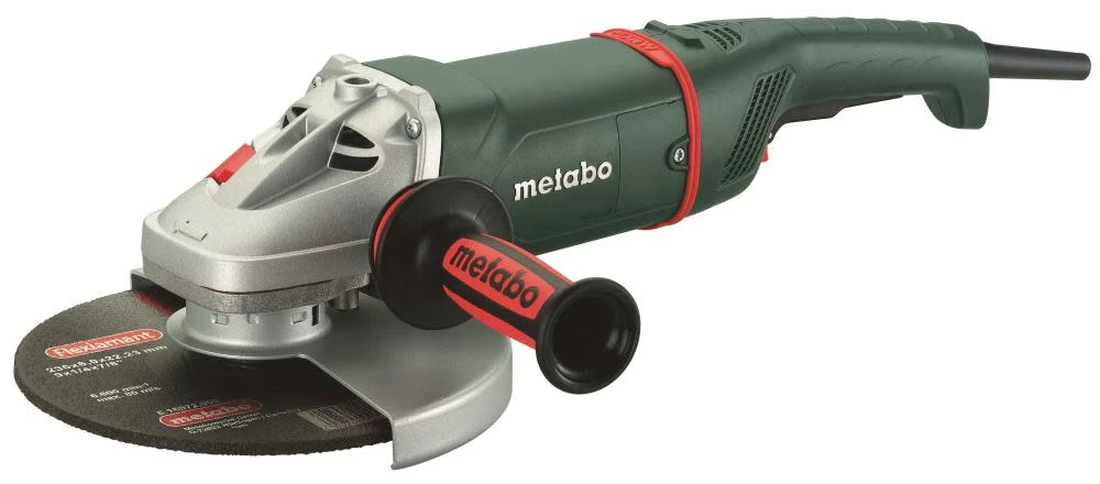 The high-output 15-Amp, 2400-Watt, 6600 rpm, AC/DC compatible motor of the Metabo® W 24-230 MVT 9-Inch Angle Grinder delivers heavy-duty performance so you can remove material quickly. An auto-stop carbon brush system provides superior motor protection while a patented Long-life dust protection system offers maximum service life. Featuring an ergonomic swiveling rear grip with safety lock switch, the Metabo electric angle grinder allows tool-free rear handle rotation and locking for maximum versatility. The convenient burst-proof guard includes a tool-less adjustment collar for improved productivity. A removable anti-vibration side handle can be mounted in three positions for added flexibility. The head assembly of the Metabo angle grinder includes a large 7/8-inch treaded arbor with spindle lock for easy accessory exchange of up to 9-inch wheels.