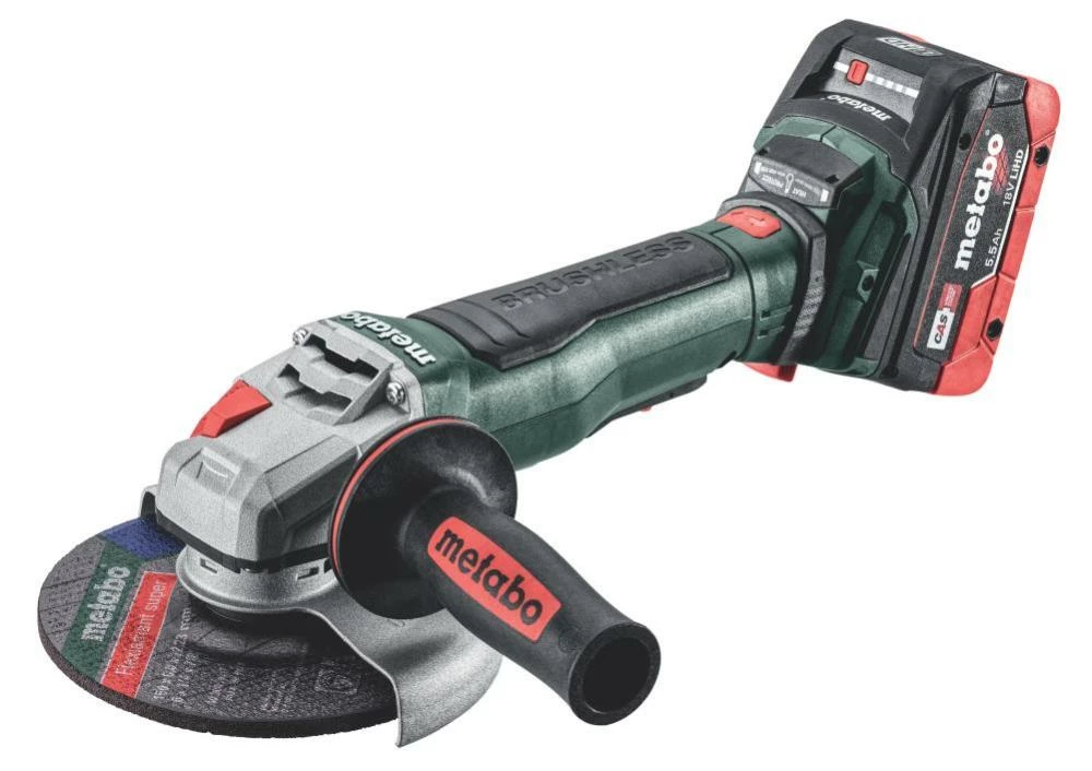 The Metabo 18V Cordless WPB 18 LT BL 11-150 Quick 5.5 Kit 6” Brushless Braking Angle Grinder is German engineered and manufactured for safety, productivity, and extreme durability in a broad range of industrial grinding, cutting, beveling, and deburring applications. Metabo’s 2nd generation BRUSHLESS Motor technology pushes true 1,100 Watt/11.0Ah corded power equivalent at 10,000 RPM, delivering 40% greater output for best-in-class performance. In addition, it runs cooler and maximizes the energy transfer from the battery to the spindle, creating highest efficiency for extended run time, and maximum continuous power and productivity. The grinder’s safety is enhanced by the patented Metabo S-Automatic safety slip clutch and electronic safety cut-out, reducing the likelihood of kickback, immediately stopping the tool, and therefore helping the user maintain control if the accessory jams. The ergonomic non-locking paddle switch is designed to reduce fatigue and de-energize the motor immediately upon release, activating the electronic Metabo Brake System and stopping the wheel in 2.5 seconds or less for enhanced operator safety. Grinding and cutting downtime is minimized with the M-Quick System for fastest tool-free wheel change at the touch of the large spindle lock button. The detachable dust filter and fully encapsulated motor ensure extreme durability by protecting the motor from dust and debris. Electronic features include tacho-constamatic (TC) speed stabilization for highest productivity, extreme overload protection, power interruption protection and soft start.