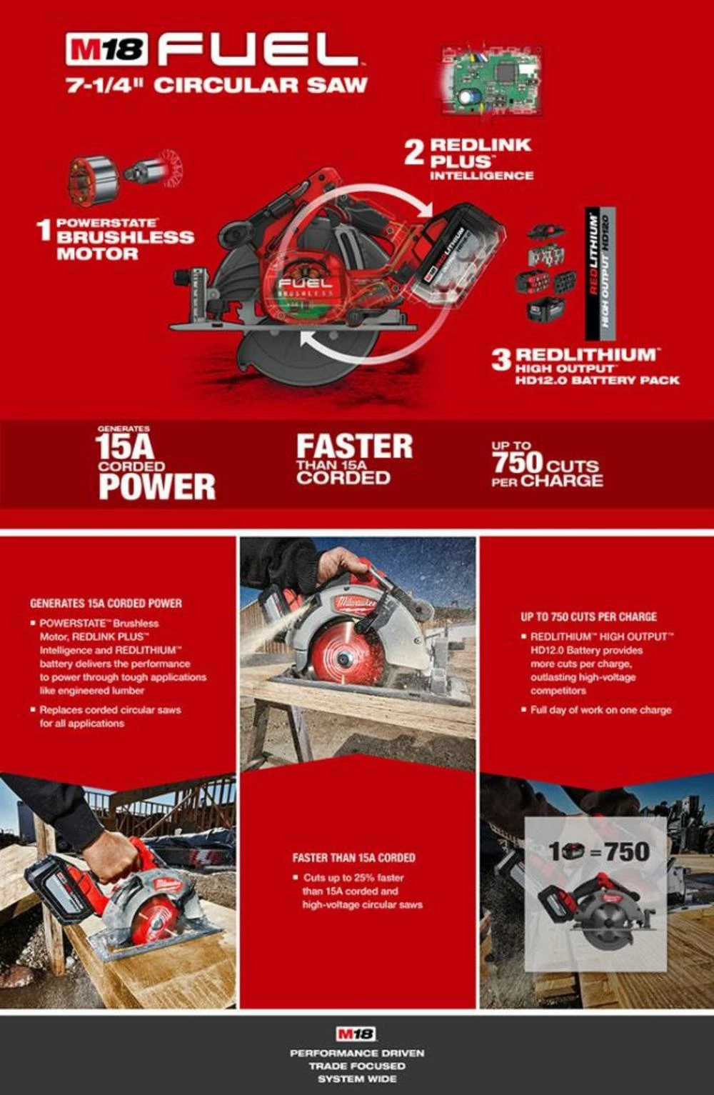 POWERSTATE™ Brushless motor: purposely built for the M18 FUEL™ 7-1/4 in. circular saw to generate the power and performance of a 15 A corded circular saw