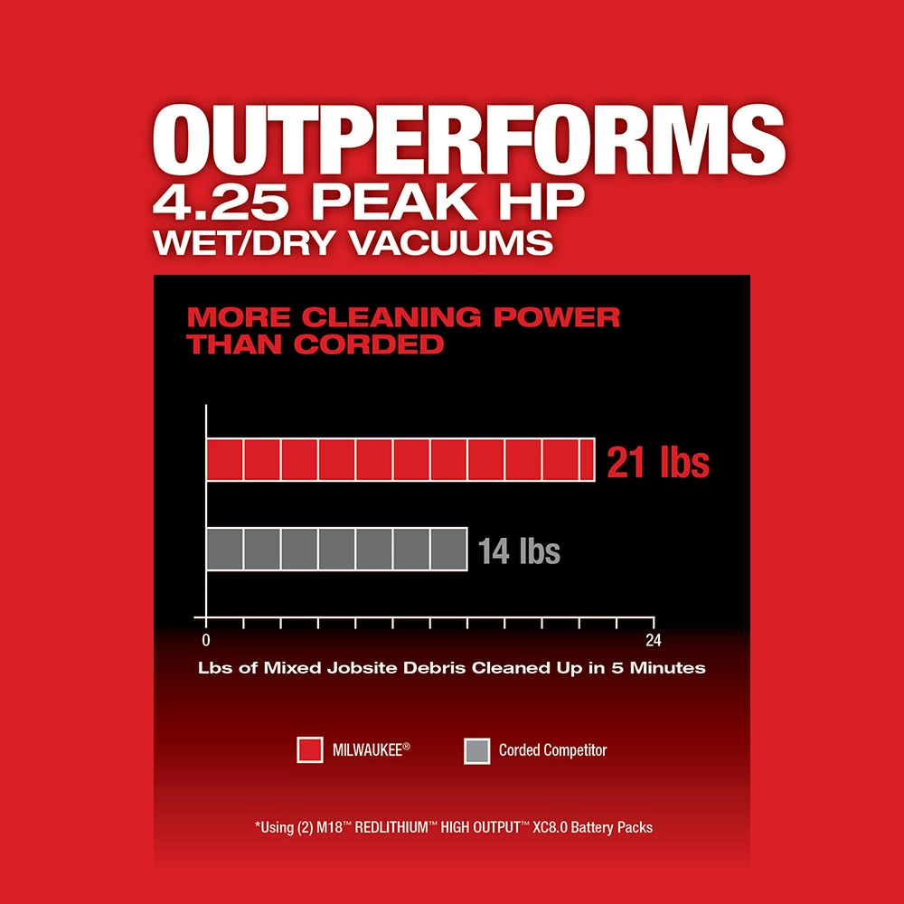 The MILWAUKEE® M18 FUEL™ 9 Gallon Wet/Dry Vacuum brings unmatched performance, durability, and versatility to jobsite cleanup. The POWERSTATE™ Brushless Motor and optimized components Outperform 4.25 Peak HP Wet/Dry Vacuums, delivering more cleaning power than corded. The Dual-Battery Motor Head requires (2) M18™ REDLITHIUM™ Batteries to operate and cleans up more common jobsite debris like drywall dust, concrete dust, and wood/metal shavings than 4.25 peak HP wet/dry vacuums in the same amount of time. This wet/dry vacuum provides the Most Durable Wheels and Hoses with reinforced casters and tread design for up to 8X wheel life and crush and twist-resistant hose for up to 2X hose life. This vac is part of the Most Versatile Wet/Dry Vacuum System with interchangeable motor heads, tanks, and carts for varying performance, holding capacity, and mobility with the easy access foot pedal. MAX POWER MODE delivers up to 34 minutes of continuous cleaning time (up to 1,400 ft²) and up to 49 minutes (up to 1,600 ft²) on MAX RUN-TIME MODE per charge on (2) M18™ REDLITHIUM™ HIGH OUTPUT™ HD12.0 Battery Packs. The included Large High-Efficiency Filter ensures optimal dust and microparticle collection. Milwaukee Fleece Dust Bags can be used for less debris build-up on the filter. Cart accessory storage allows for easy access to accessories when needed.