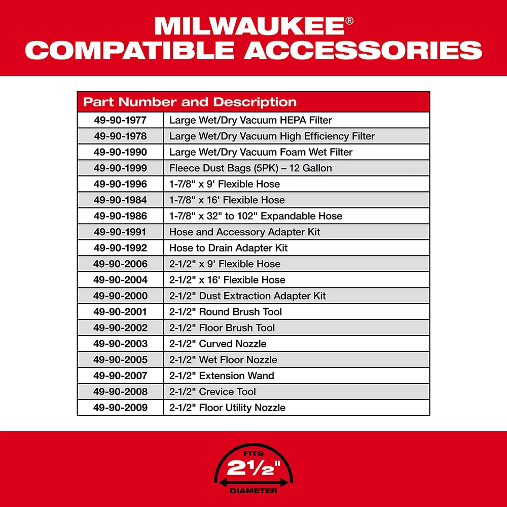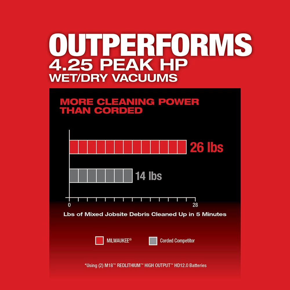 The MILWAUKEE® M18 FUEL™ 12 Gallon Dual-Battery Wet/Dry Vacuum brings unmatched performance, durability, and versatility to jobsite cleanup. The POWERSTATE™ Brushless Motor and optimized components Outperform 4.25 Peak HP Wet/Dry Vacuums, delivering more cleaning power than corded. The Dual-Battery Motor Head requires (2) batteries (included) to operate and cleans up more common jobsite debris like drywall dust, concrete dust, and wood/metal shavings than 4.25 peak HP wet/dry vacs in the same amount of time. This cordless vac provides the Most Durable Wheels and Hoses with reinforced casters and tread design for up to 8X wheel life. The crush and twist-resistant hose construction delivers up to 2X hose life. This vac is part of the Most Versatile Wet/Dry Vacuum System with interchangeable motor heads, tanks, and carts for varying performance, holding capacity, and mobility with the easy access foot pedal. MAX POWER MODE delivers up to 34 minutes of continuous cleaning time (up to 1,600 ft²) and up to 49 minutes (up to 1,800 ft²) on MAX RUN-TIME MODE per charge on (2) M18™ REDLITHIUM™ HIGH OUTPUT™ HD12.0 Battery Packs. The removable telescoping handle increases mobility with three adjustable heights. The included Large High-Efficiency Filter ensures optimal dust and microparticle collection. Cart accessory storage allows for easy access to accessories when needed.