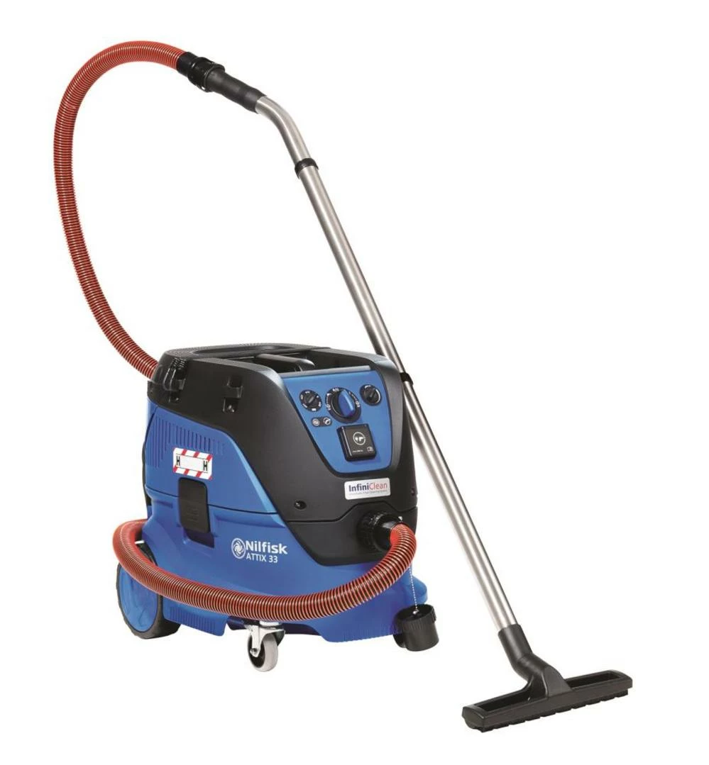 Nilfisk® Attix 33-21, 8 Gallon wet/dry vacuum, was built with real working applications in mind to deliver high performance, increased productivity and lower maintenance costs. InfiniClean filter cleaning technology automatically cleans the filter every 15 seconds to keep the working environment dust free. This dust extractor packs high suction power, provides optimal safety and maximum filtration, all while including several other user benefits designed to meet tough requirements in building and construction and other industries. The Attix 33-21 is reliable and simple to use with safe and ergonomic dust disposal to complete the job.
