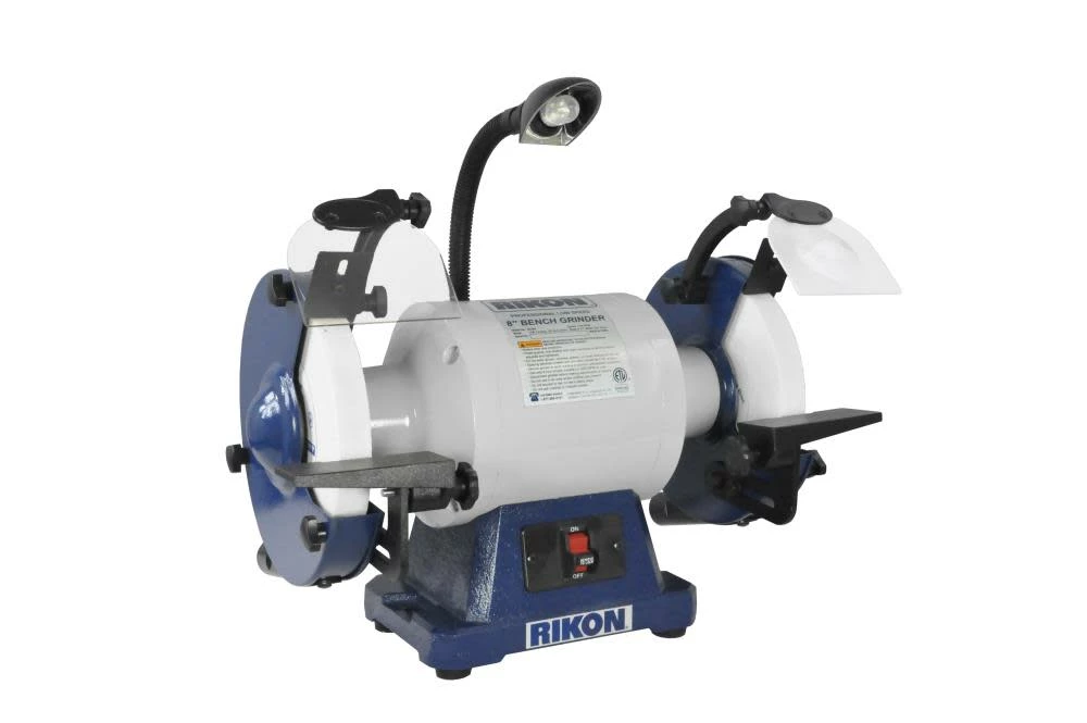 1 HP low speed bench grinder #80-808 is a larger size motor and will tackle the tough grinding jobs that are typical in production shops, as well as the finesse shaping and sharpening of hand tools. Tool rests on this machine are extra-large and flat, without a drill bit sharpening groove. Wheel flanges are cast metal. Grinder includes dual dust collection ports on the rear of the wheel guards.