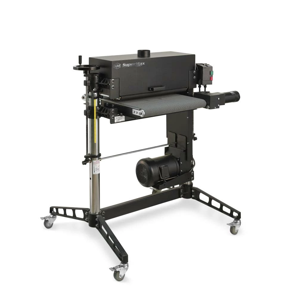 The SuperMax 25×2 Double Drum Sander speeds up time-consuming sanding tasks by applying two sanding grits in a single pass. It handles planks and boards up to 25 inches wide. This SuperMax 25×2 dual drum sander uses 220V, single-phase power to drive a powerful 5-horsepower totally enclosed fan-cooled drum motor and a variable-speed DC conveyor motor that produces 100 inch-pounds of torque. SuperMax’s 220V drum sander also features INTELLISAND technology, which monitors stock density and grain patterns and automatically adjusts conveyor speed to prevent burning and gouging. This SuperMax variable-speed drum sander has a reinforced steel conveyor bed that has less than 0.01 inches of height variance, so every sanding pass is precise, and an abrasive conveyor belt provides a sure grip on raw wood surfaces to prevent slippage or kickback. Tension rollers have height and pressure adjustments, so they hold stock securely and eliminate sniping. The SuperMax single-phase drum sander has self-cooling drums with independent height controls that offer exceptional sanding flexibility, and its metal dust cover has a 4-inch vacuum port that provides superior airflow. This sander has a minimum piece length of 2-1/4 inches and a thickness range of 1/32 to 4 inches.