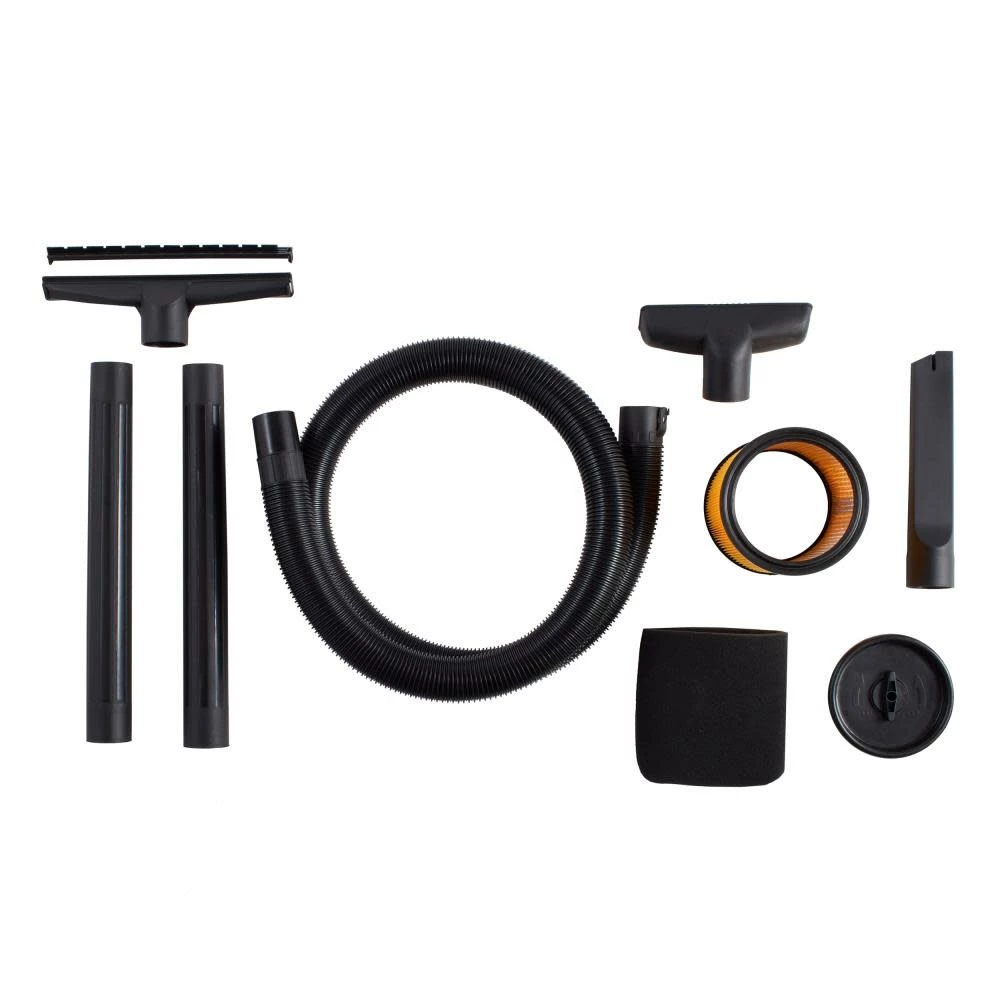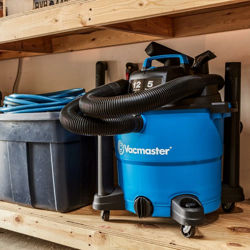 12 Gallon 5.0HP Wet/Dry Vac with blower function and hose storage integrated hose storage 12 Ft. cord with cord wrap easily converts to blower extra large drain port storage on power head large on/off dust sealed switch.