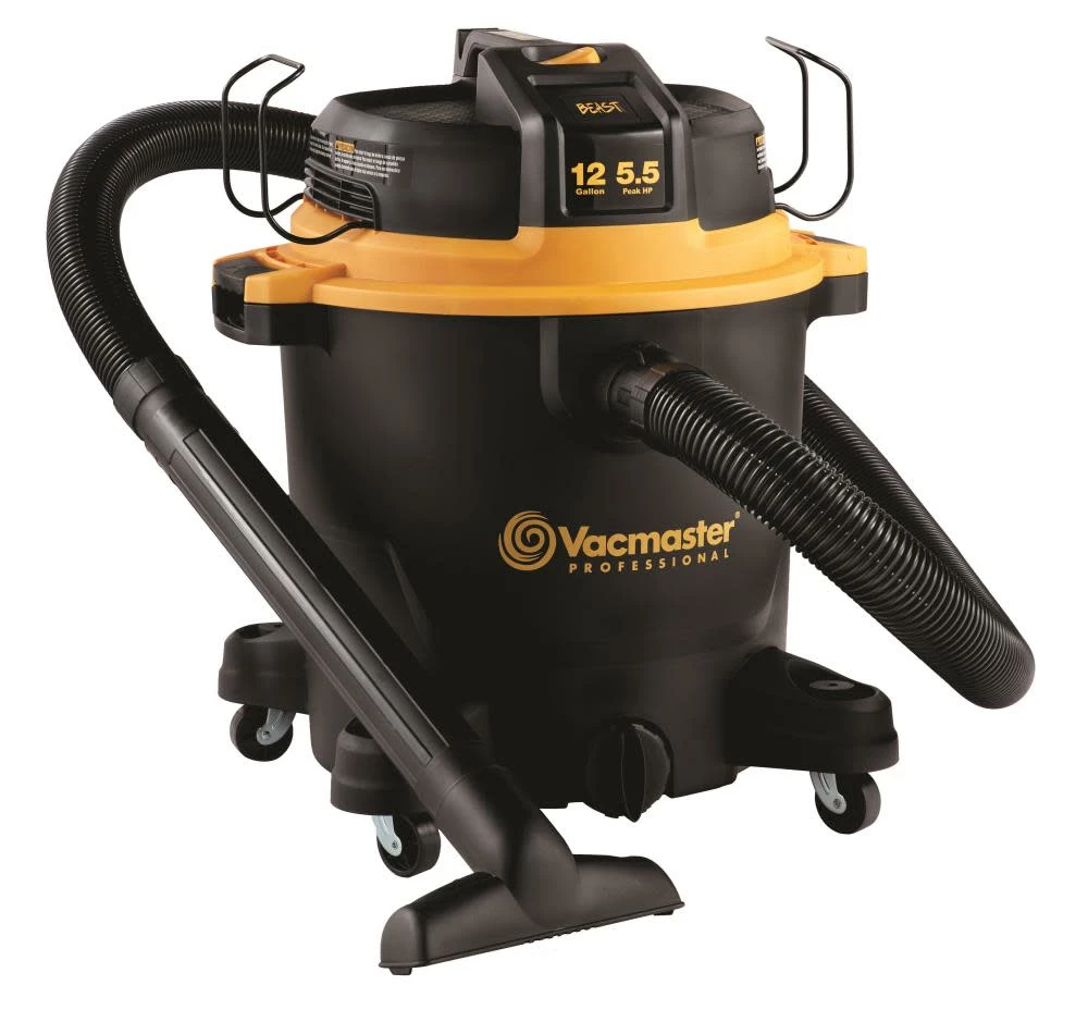 This VACMASTER PROFESSIONAL beast series 12 Gallon 5.5 peak HP Wet/Dry Vac is a powerful high-performance Vac designed to tackle the toughest cleanup projects—at the jobsite, around the shop, or in the garage. On-board hose, accessory, and power cord storage eliminates unneeded hassle and minimizes total storage space. A unique flat power head design allows you to conveniently store tools on top of the vacuum so they are easily accessible when needed. Over 27 ft. of cleaning reach (7 Ft. hose and 20 Ft. power cord) allows you to reach farther without unplugging the unit. Quickly control the power with the large dust sealed on/off switch. Heavy duty 360° swivel casters improve mobility on most surfaces. It also includes 9 accessories for nearly any task: 7 ft. x 2-1/2 in. kink resistant premium hose, utility nozzle, crevice tool, (2) extension wands, floor nozzle with squeegee and brush, fine dust cartridge filter, foam wet filter, and air noise diffuser.